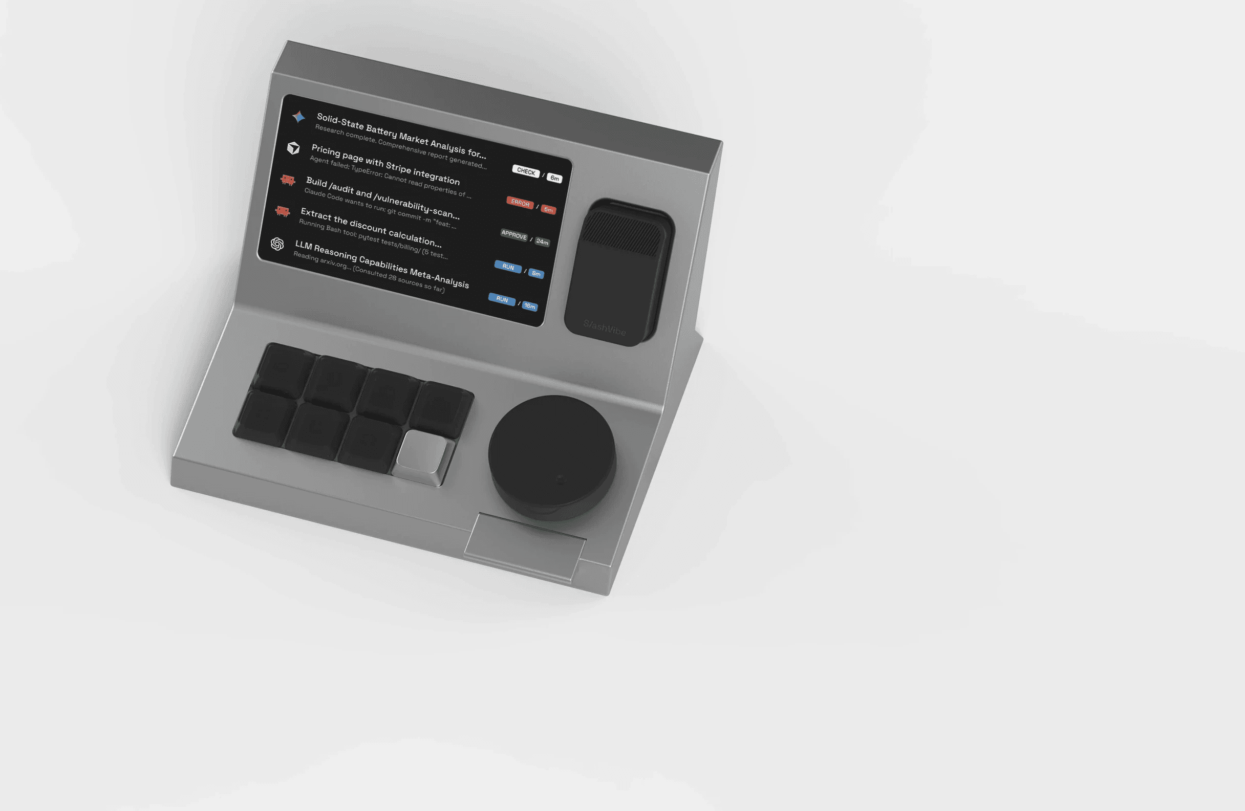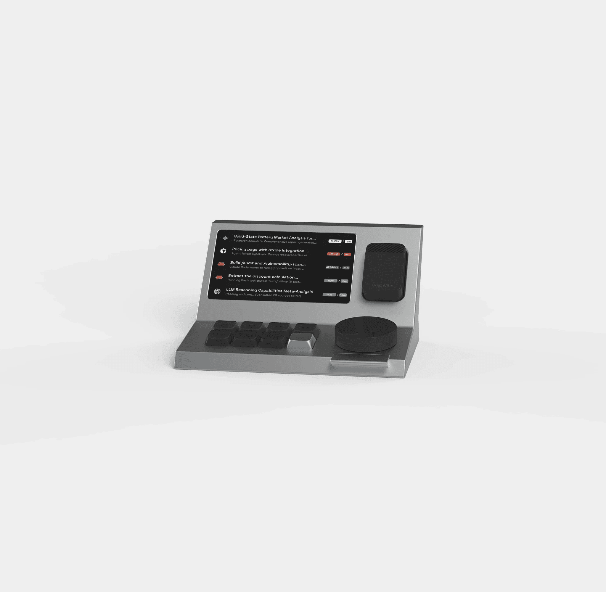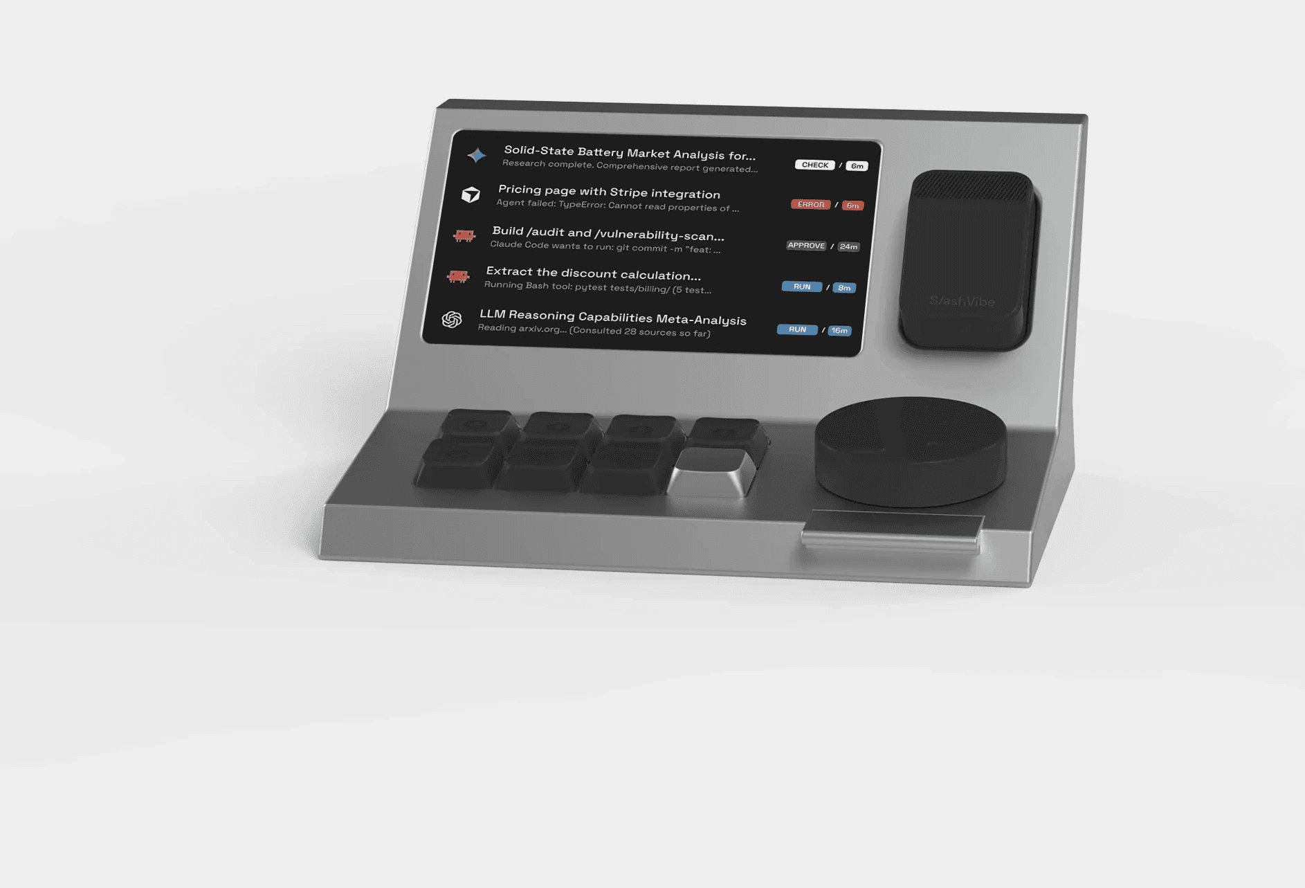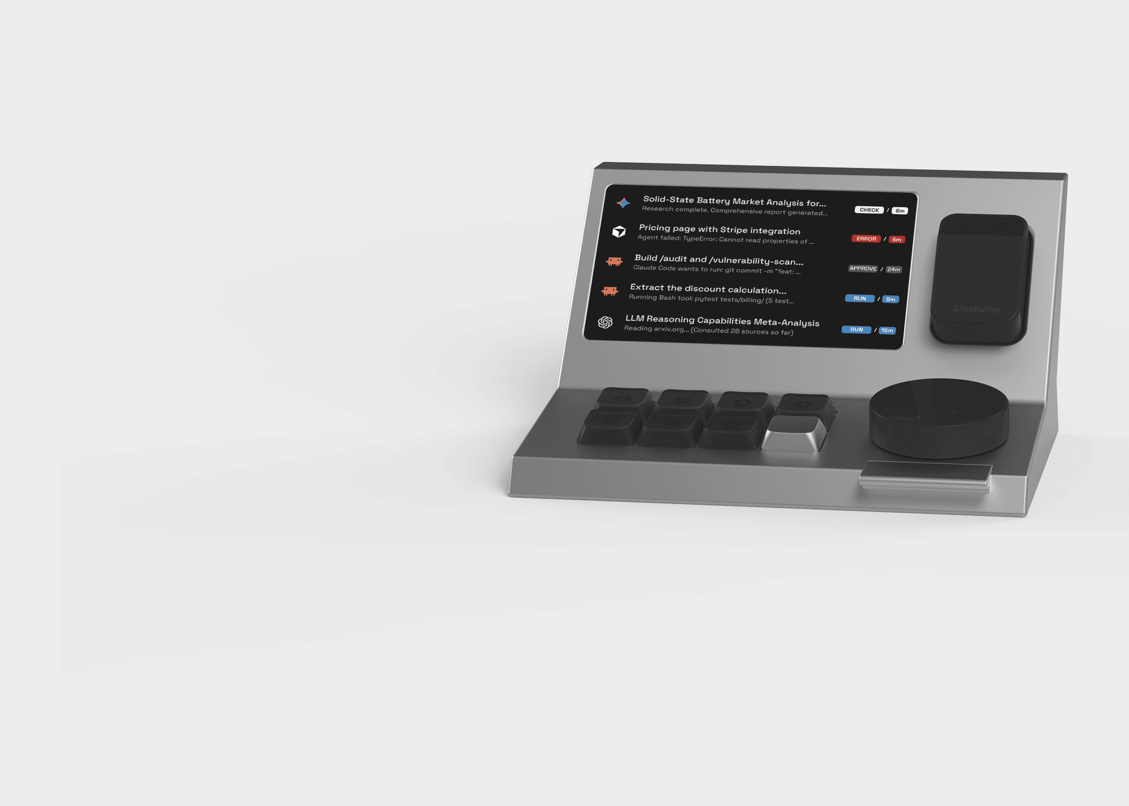 Agent's live status on a dedicated screen beside you—running, waiting, or needs you.